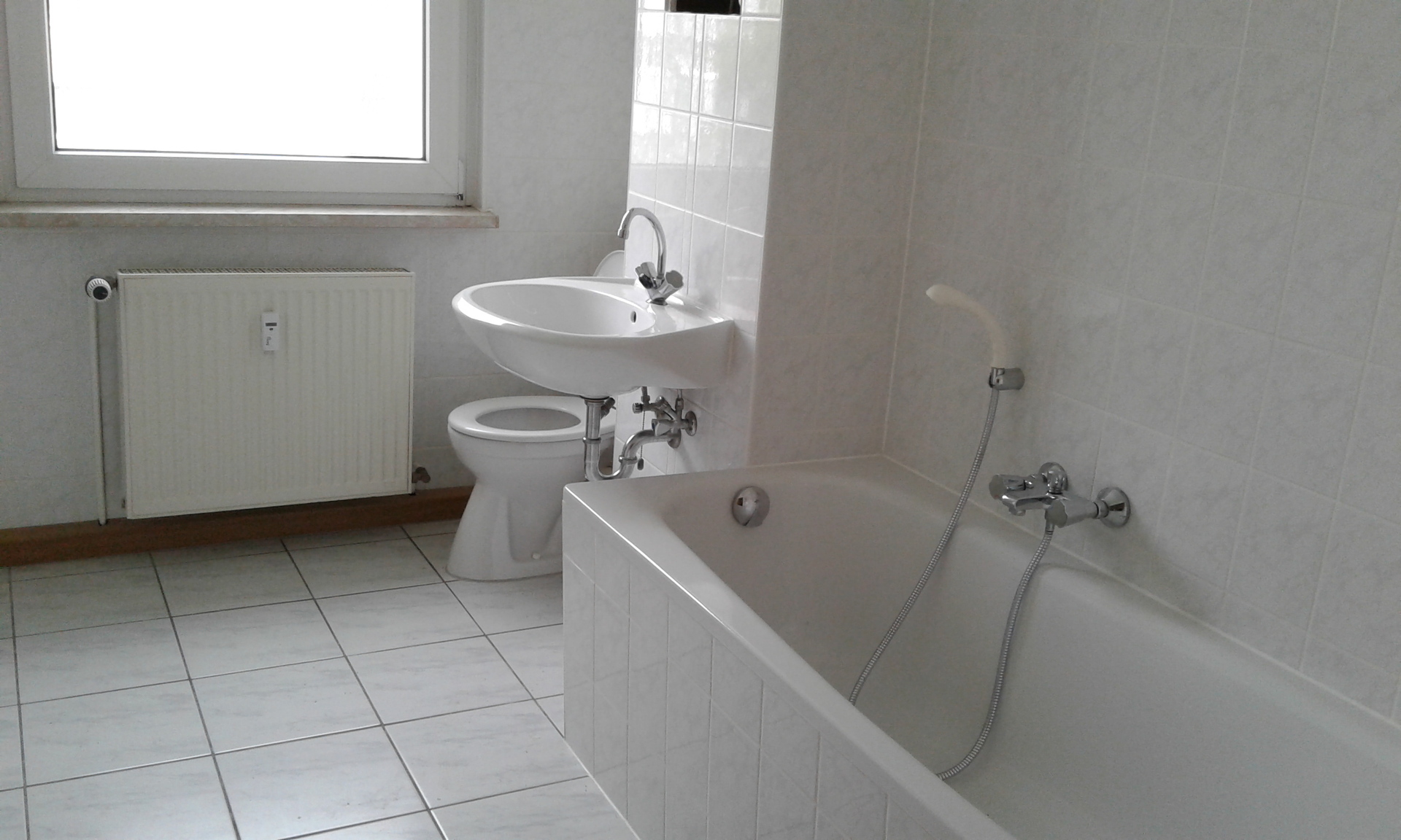 Das praktisch geschnittene Tageslicht-Badezimmer ist mit Fliesenboden, Waschtisch, Toilette und Badewanne ausgestattet.